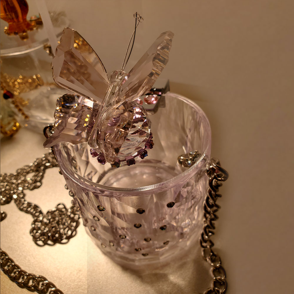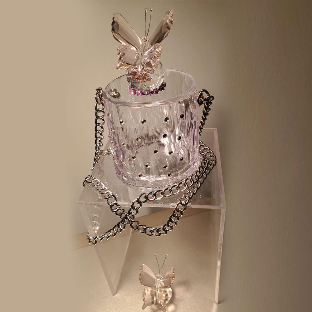 Sandra, the glass purse artist, crafts exquisite purses using Koziol* German glass, a high-quality material that must be specially ordered for each piece. Once the glass arrives, Sandra meticulously drills into the thick, durable glass to create precise holes for attaching the chic chain strap. The uniquely-crafted Sandarella Purses “base” is manufactured in Germany and is made from a resilient high-tech material designed to be virtually unbreakable. She also works with acrylic lids, carefully drilling into them to secure the sturdy hinge that allows for smooth opening and closing. Each purse is then adorned with a dazzling array of decorations, including rhinestones, crystals, and drawer pulls, along with other unique embellishments! Sandra’s attention to detail and dedication to using the finest materials results in stunning, one-of-a-kind glass purses that are as functional as they are beautiful!