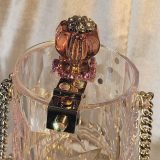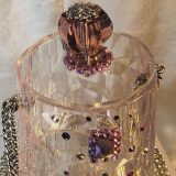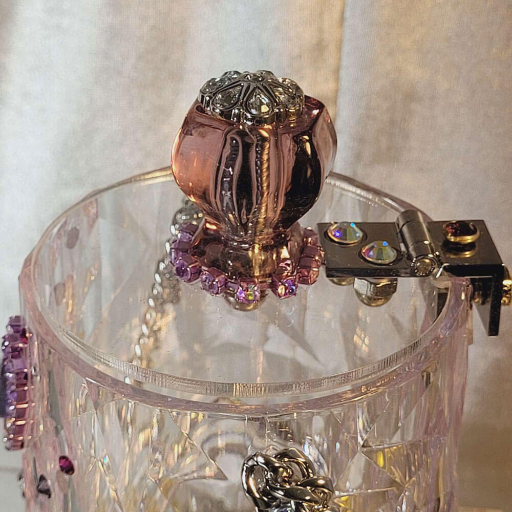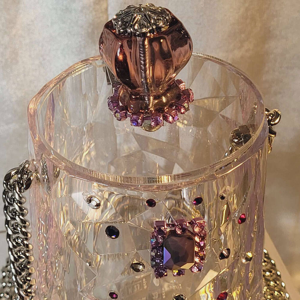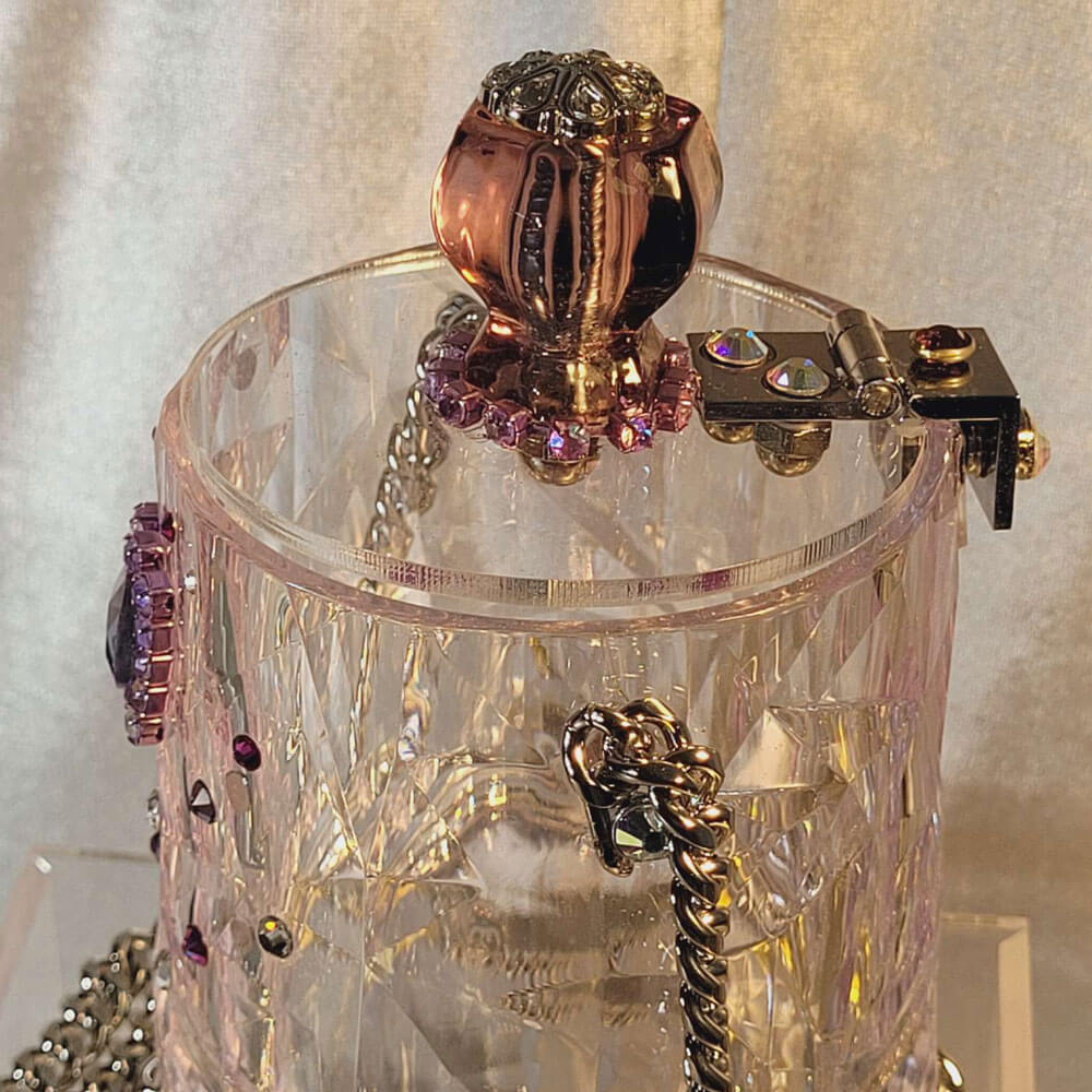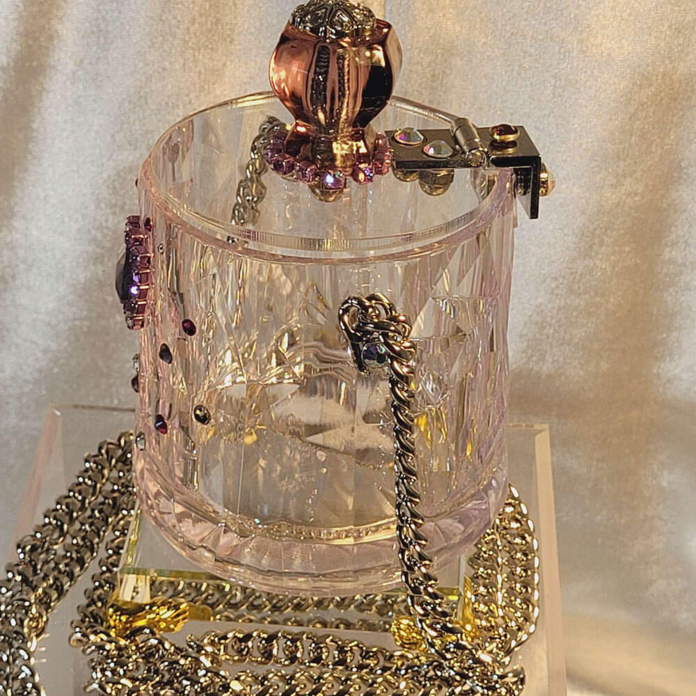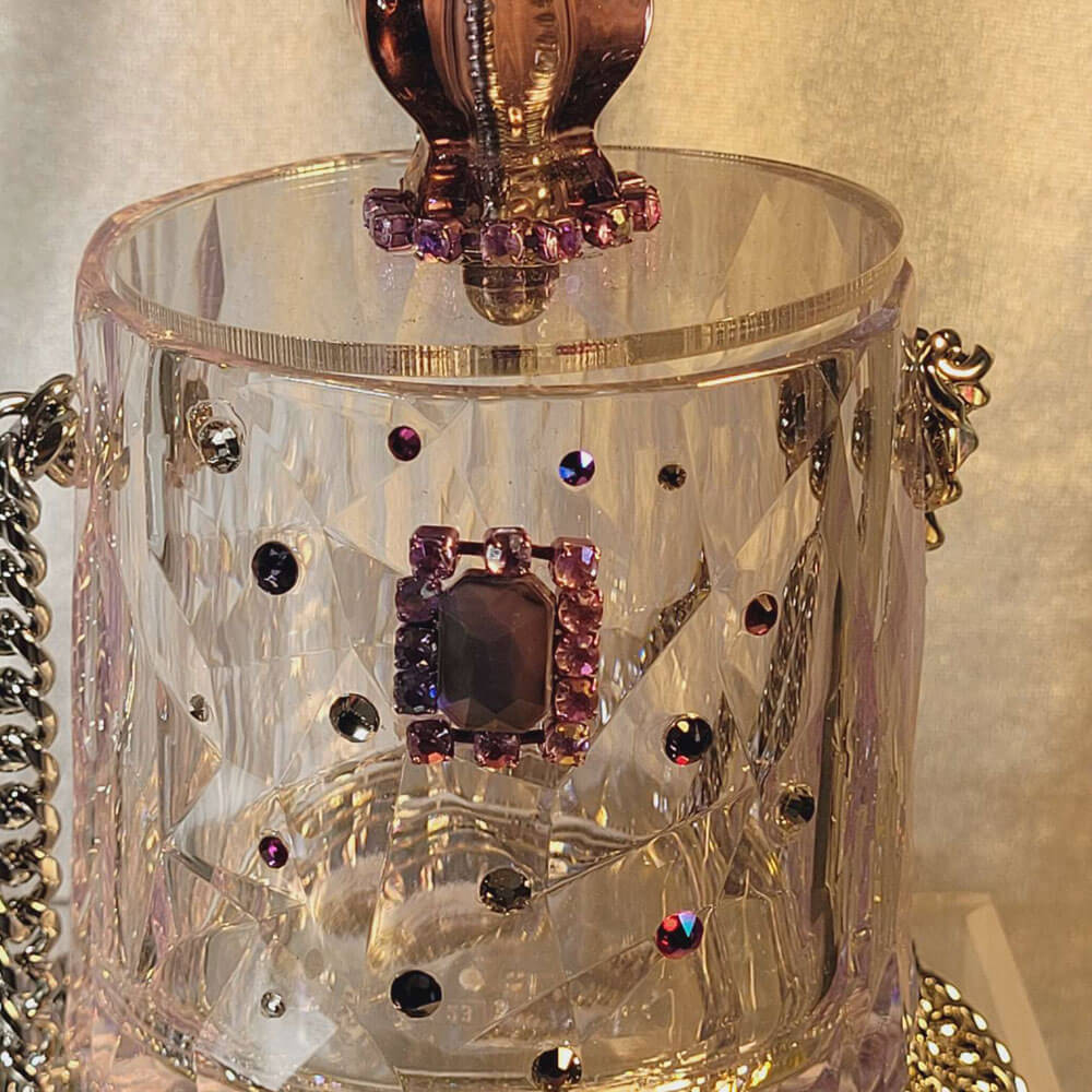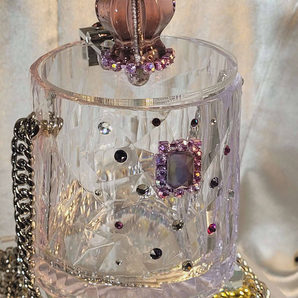 Sandra, the glass purse artist, crafts exquisite purses using Koziol* German glass, a high-quality material that must be specially ordered for each piece. Once the glass arrives, Sandra meticulously drills into the thick, durable glass to create precise holes for attaching the chic chain strap. The uniquely-crafted Sandarella Purses “base” is manufactured in Germany and is made from a resilient high-tech material designed to be virtually unbreakable. She also works with acrylic lids, carefully drilling into them to secure the sturdy hinge that allows for smooth opening and closing. Each purse is then adorned with a dazzling array of decorations, including rhinestones, crystals, and drawer pulls, along with other unique embellishments! Sandra’s attention to detail and dedication to using the finest materials results in stunning, one-of-a-kind glass purses that are as functional as they are beautiful!