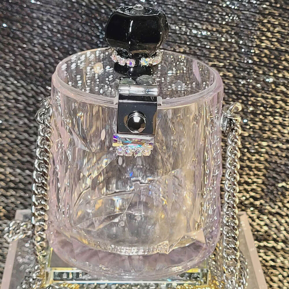 Sandra, the glass purse artist, crafts exquisite purses using Koziol* German glass, a high-quality material that must be specially ordered for each piece. Once the glass arrives, Sandra meticulously drills into the thick, durable glass to create precise holes for attaching the chic chain strap. The uniquely-crafted Sandarella Purses “base” is manufactured in Germany and is made from a resilient high-tech material designed to be virtually unbreakable. She also works with acrylic lids, carefully drilling into them to secure the sturdy hinge that allows for smooth opening and closing. Each purse is then adorned with a dazzling array of decorations, including rhinestones, crystals, and drawer pulls, along with other unique embellishments! Sandra’s attention to detail and dedication to using the finest materials results in stunning, one-of-a-kind glass purses that are as functional as they are beautiful!